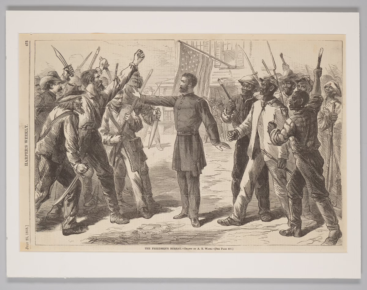 An 1868 image from Harper’s Weekly depicting a uniformed figure representing the Freedmen’s Bureau, which Congress established ahead of the passage of the 14th Amendment.