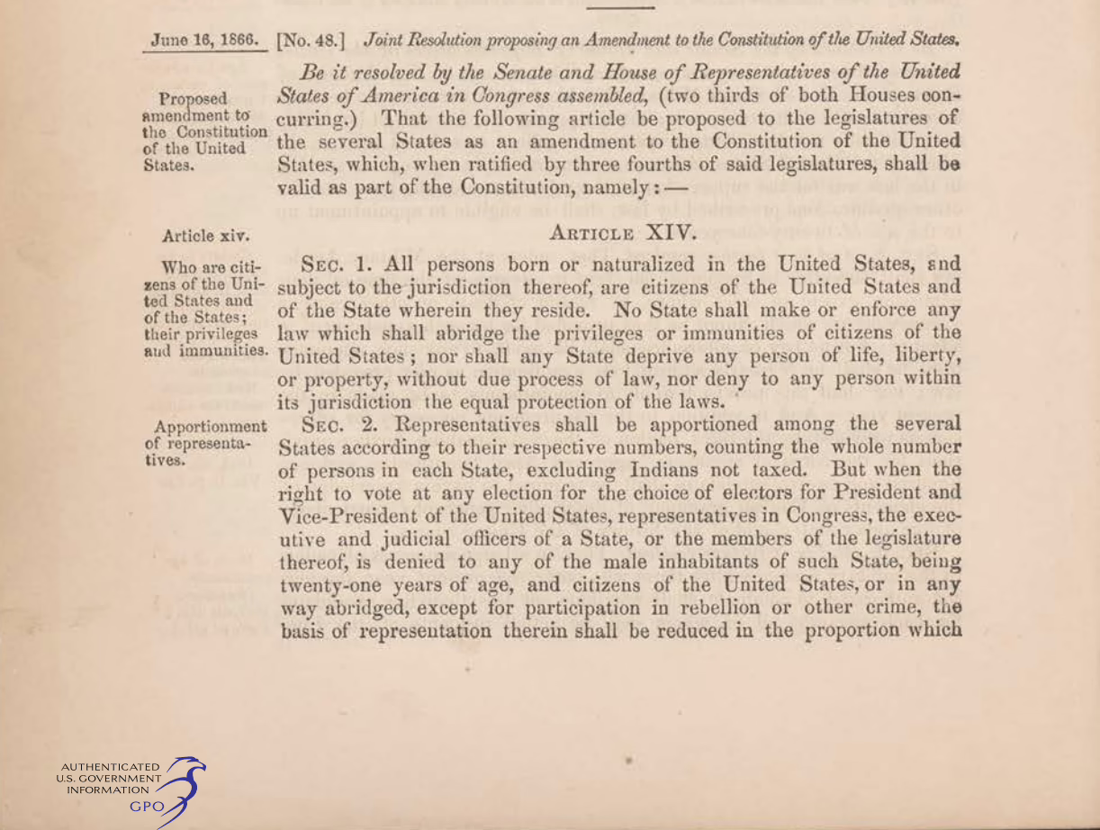 All persons born or naturalized in the United States, and subject to the jurisdiction thereof, are citizens of the United States and of the State wherein they reside. No State shall make or enforce any law which shall abridge the privileges or immunities of citizens of the United States; nor shall any State deprive any person of life, liberty, or property, without due process of law; nor deny to any person within its jurisdiction the equal protection of the laws.