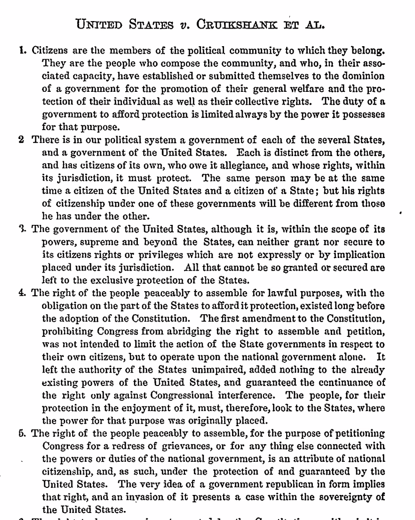 In a case arising from the 1873 Colfax massacre, during which more than 125 Black people were murdered by white supremacists, the Supreme Court ruled that the 14th Amendment only applied to state action, not to persons acting individually.